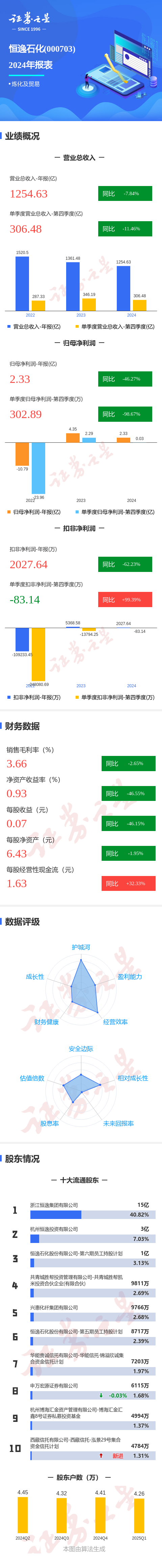 证券之星消息,恒逸石化2024年年报显示,公司主营收入1254.63亿元,同比下降7.85%;归母净利润2.34亿元,同比下降46.28%;扣非净利润2027.65万元,同比下降62.23%;其中2024年第四季度,公司单季度主营收入306.48亿元,同比下降11.47%;单季度归母净利润302.9万元,同比下降98.68%;单季度扣非净利润-83.14万元,同比上升99.4%;负债率71.42%,投资收益4.81亿元,财务费用28.84亿元,毛利率3.66%。